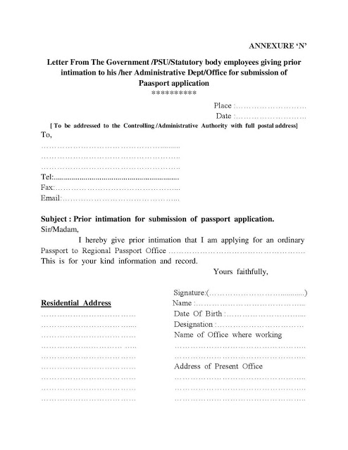 அரசு பணியில் உள்ளவர்கள் Passport அலுவலகத்திற்கு விண்ணப்பம் அனுப்புவதற்கு முன்பே அவரவர் appointmentauthority க்கு மேற்காணும் இணைப்பு படிவத்தை அனுப்பிவிட வேண்டும்.அதன் அசல் கடிதம் ஒன்றை (செராக்ஸ் கூடாது) passport அலுவலகம் செல்லும் போது அங்கு கொடுக்க வேண்டும். இதில் பெறுநர் முகவரி pin code உட்பட முழுமையாக தெரிந்திருக்க வேண்டும்.பெறுநர் பெயரும் தெரிந்திருக்க வேண்டும்.